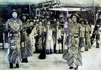 據(jù)南方都市報(bào)報(bào)道,在珠海發(fā)現(xiàn)的一組清末宮廷黑白照片均為15厘米長(zhǎng)、10厘米寬規(guī)格,照片粘在一本封面封底鑲有吉祥圖案花布的折疊本上。其中的一張是慈禧太后坐在荷花池旁,模仿傳說(shuō)中觀世音的模樣,慈禧太后兩旁立著兩個(gè)穿著袈裟、閉目誦經(jīng)的太監(jiān),慈禧太后后面是一幅巨型竹林畫,從照片中還可見(jiàn)到竹林畫中嵌著一塊寫有“普陀山觀音大士”的紙板。