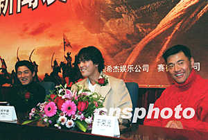 總投資七百萬美元、有韓國版《英雄》之稱的《武士》四日在北京舉行中國首映禮,欲與熱播中的《英雄》一爭高下。圖為片中主角韓國當紅影星朱鎮(zhèn)模、鄭宇盛、與中國影星于榮光(從左至右)與北京媒體見面。作者:武仲林