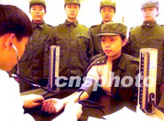 北京解放軍某部八日對新兵進行身體復查,不合格者退回原籍。解放軍部隊每年都要對新入伍的戰士按照體格標準進行全面復查身體,以確保士兵體格健壯。作者:宋吉河