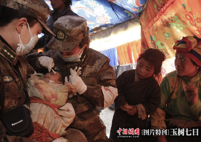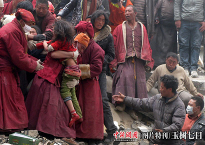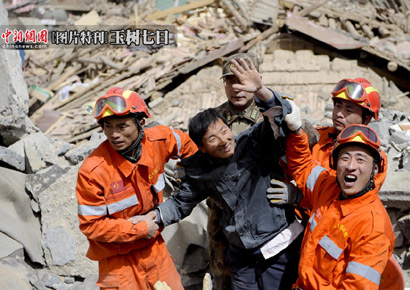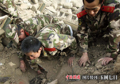 武警戰士在玉樹地震廢墟里救助被困民眾