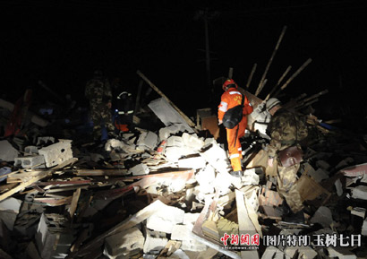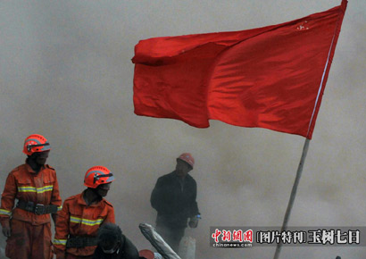 20日各地救援隊在結古鎮災區煙塵中堅持抗震救災