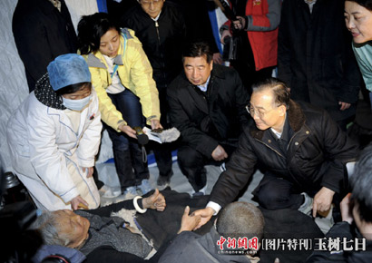 溫家寶在青海省玉樹縣玉樹自治州醫院看望受災民眾