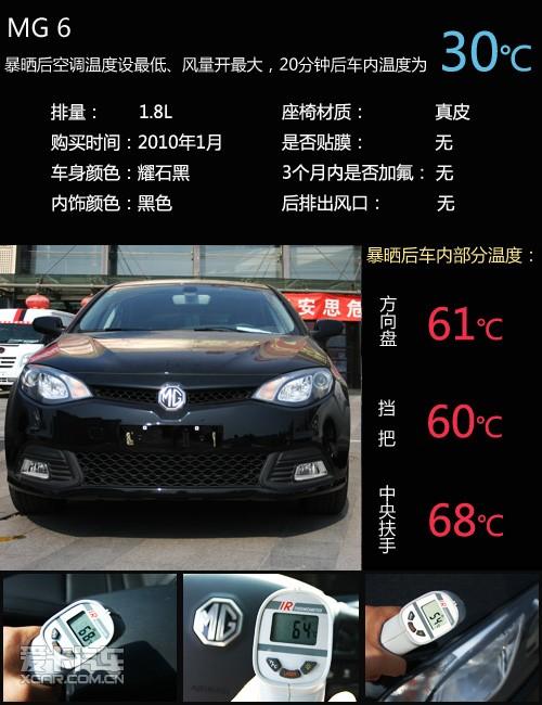 內外通黑沒有貼膜的MG6車身溫度達到54攝氏度,門把手微燙,開啟空調后車內降溫速度沒有想象的迅速,要是有后排出風口車內溫度下降應該會更加均勻。