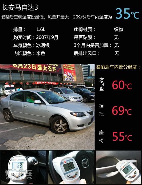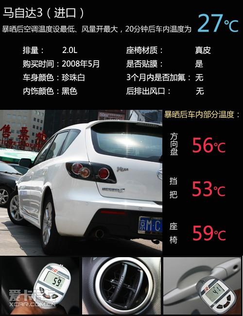 進口馬自達3在暴曬時路人的回頭率很高,也許是官方進口時沒有這個配色,所以珍珠白自噴漆的它在路上十分惹眼。捏住出風口大大的葉片就能控制出風方向,用起來十分方便。空調賣力工作20分鐘后,最終車內溫度下降到了27度。