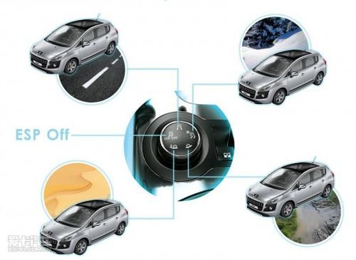 標致3008還有一個值得一提的功能就是抓地力控制系統;其由一個先進的牽引力控制系統和特殊的泥/雪輪胎,通過自動調節前輪的牽引力輸出方式和功率來達到對應的效率。標致的這套系統通過人工來進行切換,其一共有五個控制檔位:標準、雪地、越野(泥地、爛路、濕滑草地)、沙石地和關閉;通過調節不同的檔位來適應不同的路面情況。