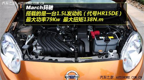 目前,該車搭載的是一臺全新的1.5L發動機(代號HR15DE),最大功率79Kw;最大扭矩138N·m。要知道在歐洲,瑪馳還有另外兩款發動機可供選擇,一臺是最大功率為59kw,最大扭矩108N·m的1.2L 3缸發動機;另一臺則是1.2L機械增壓直噴發動機,最大功率72kw,最大扭矩142N·m;與這兩款發動機相匹配的是5AT或CVT變速箱。然而,引進到國內后,東風日產瑪馳的動力總成部分改為了現在的1.5L發動機+5MT或4AT變速箱。