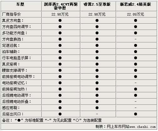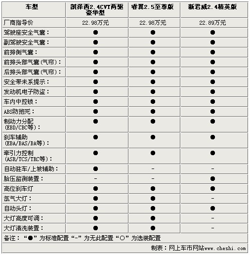 影音系統方面,三款車都為使用者提供了多揚聲器的配置,除了AUX/USB接口外,凱澤西還配備了單碟CD,而睿翼則配備了更為便利的6碟CD系統,新君威為單碟DVD。通過以上參數配置方面的比較,對于三款22.98萬左右的中級車,配置方面基本打成平手,僅在一些細節方面有所出入,不過動力方面凱澤西確是實實在在的戰勝了睿翼和新君威,幾乎將2.4L引擎的動力發揮到了極致。