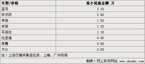 根據(jù)網(wǎng)上車市網(wǎng)站價(jià)格監(jiān)測(cè)系統(tǒng)顯示,以來(lái)自北京、上海、廣州三地城市為代表的上述8個(gè)熱銷品牌都出現(xiàn)了較大幅度的讓利優(yōu)惠。而另一方面國(guó)內(nèi)上半年的汽車生產(chǎn)量已經(jīng)超過(guò)800萬(wàn)臺(tái),國(guó)內(nèi)各大汽車交易市場(chǎng)和4S經(jīng)銷商處都出現(xiàn)了“庫(kù)存壓力”的報(bào)告。其中不乏BMW、沃爾沃這樣的高端品牌,而其它品牌多以大眾化品牌居多,它們當(dāng)中最小優(yōu)惠金額也在5000元以上至3.1萬(wàn)元之間。