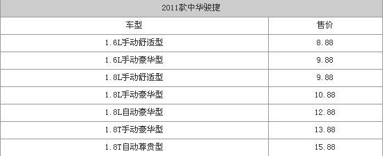 2010年7月8日,華晨中華正式推出了2011款駿捷車型,此次推出的新車共有7款不同配置的車型,分為1.6L、1.8L、1.8T三種動力調教。據悉,新車整體的售價區間為8.88-15.88萬元。