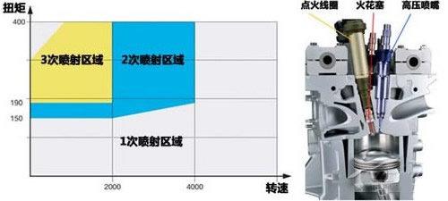 配合均質燃燒模式的缸內直噴技術,在噴射邏輯上,根據不同的發動機工況采取不同的多次噴射技術,即一個發動機點火循環中進行多次噴射,更高效地形成混合氣。