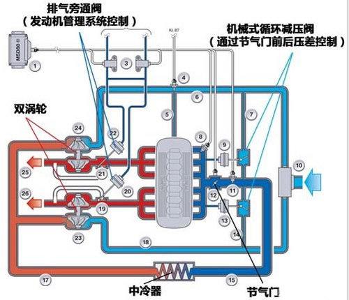 低轉速或者怠速的時候,排氣旁通閥完全關閉,所有的廢氣通過兩個輕質小渦輪,獲得最大的增壓效果,提高低轉速下油門響應性以及動力輸出;在發動機滿負荷的情況下,通過部分打開排氣旁通閥以獲得一個比較恒定的增壓壓力,不增加耗油量。
