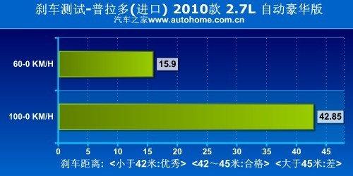 加速偏弱或許對一些人來說不是問題,而剎車無論如何都不能含糊。這一點上普拉多的表現得很稱職。盡管由于車身較高,剎車姿態看起來有些令人不安,但從100公里/小時剎車到靜止只需要42.85米,而且剎車一直穩定在43米左右,已經算是非常不錯的成績。