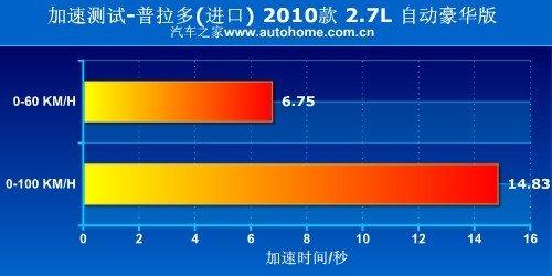 在加速測試中,2.7L發動機動力較弱的特點暴露無遺。起步時車輛出奇的安分,發動機被無情的壓制在低轉速區間,而攀升的過程又顯得特別漫長。另一方面,齒比稀疏的四擋變速箱對于這種動力偏弱的車型來說是不太利于加速的。因此,普拉多0-100公里/小時跑出14.83秒的加速成績也就不足為奇了。