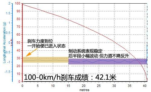 受到輪胎溫度、系統狀態等多方面因素影響,第一次測試成績超過了43米,不過之后寶來迅速進入狀態,連續的高強度測試下沒有出現熱衰減現象,表現一直穩定,尤其是卡鉗的制動力度能維持在較高水平。