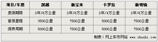 選擇的四款車型都是市場(chǎng)上相對(duì)銷量比較靠前的熱門車型,新凱越是別克旗下的緊湊級(jí)家用車,質(zhì)保期為2年/6萬(wàn)公里,一個(gè)合資車比較常規(guī)質(zhì)保期限。同為2年/6萬(wàn)公里還有一汽大眾品牌的新寶來,以及上海大眾斯柯達(dá)的新明銳。豐田卡羅拉是四款車型中唯一一款日系車型,2年/4萬(wàn)公里的質(zhì)保期比較起來少有遜色。
