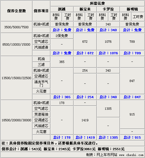 別克新凱越首保時(shí)間是四款車型中最短的,但廠家提供前兩次免費(fèi)保養(yǎng),這點(diǎn)看來還比較貼心。18500公里結(jié)算后,543元的總保養(yǎng)金額是四款車中最少的一個(gè)。新寶來和新明銳同為大眾品牌下車型,但由于合作商不同,保養(yǎng)的費(fèi)用還是存在一些細(xì)微的差距,都在2600元范圍內(nèi)。日系車一貫是經(jīng)濟(jì)實(shí)惠見長(zhǎng),但在后期保養(yǎng)的方面豐田卡羅拉的費(fèi)用卻是四款車中最高的,超過3000元的數(shù)字也是新凱越保養(yǎng)費(fèi)用的5倍多。