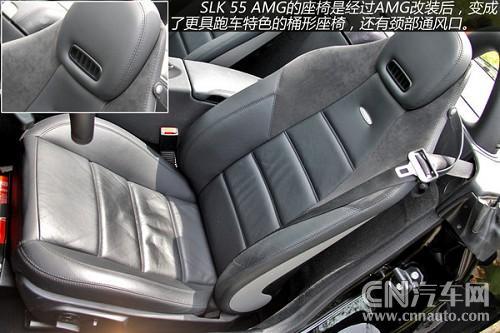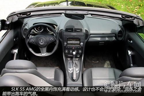 內裝一樣非常有個人風味的SLK55,座椅、內門板、中央扶手均為Nappa高級真皮制成,并且有四種顏色可供選擇,AMG的座椅另外還經過包覆與支撐性的加強,肩部亦可追加Alcantara麂皮,藉以應付激烈操駕的需求。此車的其它不同點尚包括320km/h時速表、跑車方向盤、鋁合金腳踏板、專用地毯、不銹鋼門檻等等,而Thermatic自動空調、室內照明組也列為標準配備。