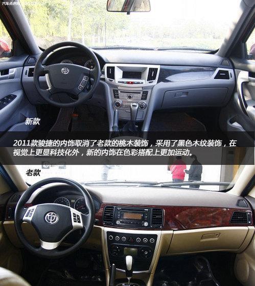 2011款駿捷的內飾取消了老款的桃木裝飾,采用了黑色木紋裝飾,在視覺上更顯科技化外,新的內飾在色彩搭配上更加運動。中控臺和老款車型差異很大,采用了大量的按鍵設計,中控鎖、后備箱開關、油箱開關集成在最上面。新款駿捷的三幅方向盤改成了四幅式設計,感覺更加穩重。