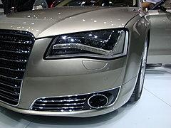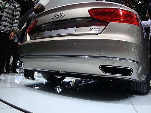 全新奧迪A8L W12 quattro在車身外觀上還有一系列的改進(jìn),包括單幅式水箱進(jìn)氣格柵,其中間為鉻金屬噴涂的橫條裝飾。在其空氣通風(fēng)口以及側(cè)后視鏡邊緣還擁有鉻金屬的嵌入物裝飾。其進(jìn)氣格柵處及車尾還配有W12的標(biāo)志,以顯示該車身份的不同。梯形的雙尾氣排放管與后保險杠完美的結(jié)合在一起。
