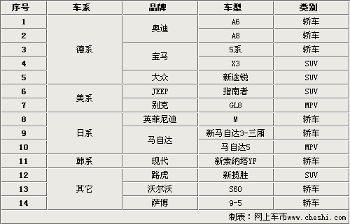 隨著中國汽車市場的逐漸成熟,越來越多的汽車廠商將重點(diǎn)放在了中國汽車市場。目前在中國汽車市場上熱銷的部分車型經(jīng)過幾年的洗禮,即將迎來它們的全新?lián)Q代產(chǎn)品,這些車型無疑將會使原本競爭激烈市場變得更加厲害,同時也豐富了消費(fèi)者對車型的選擇。我們細(xì)數(shù)了一下下半年上市的新車,從中發(fā)現(xiàn)了14款即將全新?lián)Q代的車型,其中不乏一些重量級產(chǎn)品,它們無論是從動力系統(tǒng)、舒適配置還是車身尺寸都得到了提升。譬如:奧迪的A8、A6;寶馬的全新5系和X3;路虎的全新攬勝;沃爾沃S60等等。具體車型見下表: