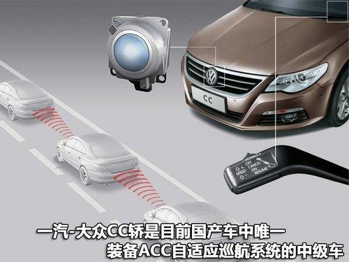 一汽-大眾CC轎跑車是目前唯一裝備ACC自適應(yīng)巡航的國產(chǎn)車型,提升了舒適性和安全性。除此之外,F(xiàn)ront Assist預(yù)碰撞安全系統(tǒng)、Lane Assist車道保持系統(tǒng)、Park Assist智能泊車輔助系統(tǒng)以及Rear Assist后視影像系統(tǒng)也均出現(xiàn)在一汽-大眾CC的高配車型上。