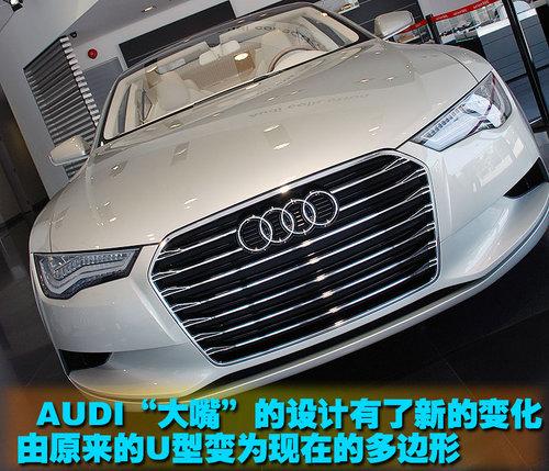 在正面特征上,概念車仍然具備奧迪標志性的的“大嘴”進氣格柵。但是略加觀察您也會發現這款概念車的進氣格柵又目前國產A6L的U型改變為了類似于多邊梯形的形狀。而“奧迪四個圈”的LOGO位置也設計的比較靠上而不是中間或是下方。