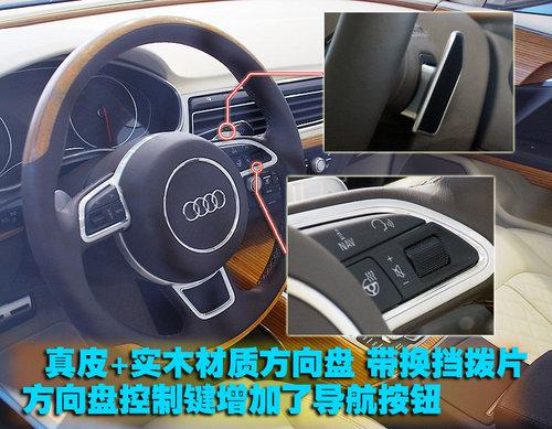 方向盤部分能夠看到奧迪專為跑車化而設計的三幅運動型方向盤,通常A8的方向盤是更加舒適化的4幅方向盤。真皮縫制與實木材料的應用是奧迪為豪華車市場專門打造的。在這里我們發現了以前奧迪并未在方向盤上安裝的“Nav”即導航按鈕。