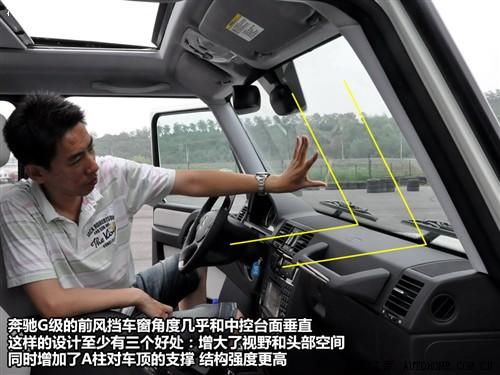 奔馳G級的車窗按鍵放置的位置比較特殊,不是像一般車型那樣放在車門扶手上,而是放置在車門最頂端的水平面上。這樣的設計顯然使用起來不夠方便,但它的目的我們猜想應該是出自涉水的考慮,較高的位置不會輕易被水淹沒,也就不會因進水而失靈。