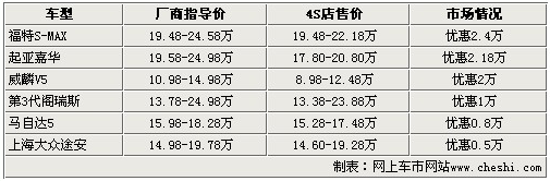 通過(guò)上表我們可以看出,六款車型在售價(jià)方面都有不同程度的下浮。其中以嘉華、福特S-MAX和威麟V5為首的大幅度降價(jià)車型,降價(jià)幅度都達(dá)到了2萬(wàn)元以上。第3代閣瑞斯獨(dú)領(lǐng)一萬(wàn)元降價(jià)區(qū)間,馬自達(dá)5和途安這兩款更為熱銷的車型,由于關(guān)注度較高,現(xiàn)車也較為緊張,優(yōu)惠幅度也僅有5千元和8千元的小幅度降價(jià)優(yōu)惠。