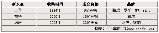 從1994年1月寶馬以8億英鎊收購路虎、羅孚、MG、迷你等一系列品牌之日起,路虎汽車就走上了輾轉的“被交易”之路。2000年,由于不堪重負,寶馬汽車以18億英鎊的價格將路虎品牌出售給了福特,結束了6年的糾結長跑。2008年,福特汽車又以23億美元的價格,將路虎和捷豹品牌賣給了印度新興汽車巨頭塔塔公司,專注于生產研發福特汽車,25億美元收購捷豹,18億英鎊收購路虎,最終僅以23億美元就將兩大豪華品牌出售,福特汽車也算是忍痛割愛了。15年內的3次交易,金額超過60億美元,創造了汽車品牌收購的一大歷史性金額。