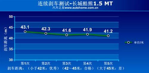 除了出色的乘坐和儲物空間,酷熊的動力和經濟性也有不錯的表現,從其連續制動的工況圖中可以看出,酷熊的平均制動距離在42米左右,且剎車系統的穩定性也比較強。而在油耗測試中,6.7L/百公里的成績也低于我們的預期。