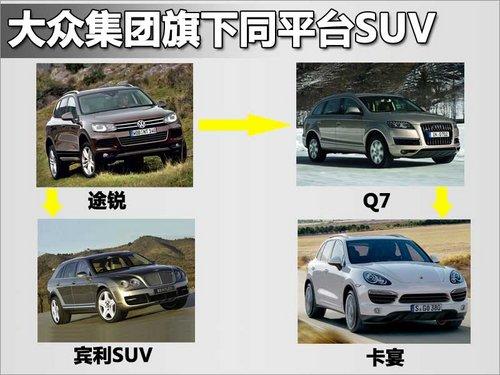 大眾集團(tuán)旗下?lián)碛卸鄠(gè)高端以及豪華品牌,例如蘭博基尼、保時(shí)捷、布加迪還有賓利。其中布加迪、賓利、保時(shí)捷在產(chǎn)品上更多的受到了大眾品牌在技術(shù)上的影響。而在SUV產(chǎn)品方面也亦如此,最為明顯的例子在于大眾途銳、保時(shí)捷卡宴、奧迪Q7的相同平臺(tái)、部分技術(shù)以及零件的共通化就為三款車型帶來了更小的研發(fā)成本和更短的研發(fā)時(shí)間。
