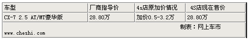 作為一款具有跑車化外觀和馬自達操控DNA的中型SUV,馬自達CX-7自去年11月上市以來一直備受關注。根據(jù)網(wǎng)上車市價格監(jiān)測系統(tǒng)顯示,自CX-7上市以來,各4S店一直持續(xù)提現(xiàn)車加價0.5萬-3.2萬元,而近期北京馬自達4S店出現(xiàn)了平價銷售現(xiàn)象,售價為廠商指導價28.8萬,少量現(xiàn)車供應。具體車型價格如下: