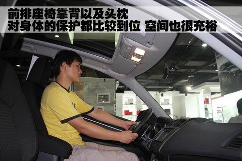 三菱ASX勁炫后排座椅靠背與坐墊的角度適中,不同身材體型的乘員在乘坐時能夠找到舒適的姿勢。但這款車的后排稍顯緊湊,頭部空間和腿部空間相對比較狹小。圖中的模特身高180厘米左右,頭部幾乎已經要頂到車頂。