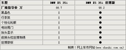 新X5 35i世博版以普通版35i為基礎,在88.7萬元的基礎上增加了7項配置價格也相應的提升了9.5萬元。不過雖然價位提升了9.5萬元,但是它的世博限量版概念以及增加的個性化配置倒也算得上比較劃算。