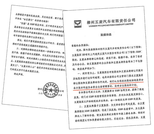 7月26日,柳州五菱汽車有限責任公司(以下簡稱五菱集團)發表致媒體公開信,明確到目前為止,五菱集團沒有就股權和五菱品牌轉讓問題與其他股東進行過任何磋商,也尚未接到公司主管部門要求五菱集團轉讓股權和五菱品牌的任何決定。五菱集團認為,現在的股權結構是符合各方股東利益及合資企業經營需要的,沒有出讓股權的計劃……五菱集團從開始到現在并在將來,會一如既往支持上汽通用五菱的發展。