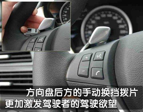 寶馬X6是其X系列中唯一標(biāo)準(zhǔn)配置帶換檔撥片方向盤的車型。由于換擋撥片集成在方向盤上,所以無論方向盤處于什么位置,駕駛者都可以用換檔撥片平滑而舒適地進(jìn)行升降檔。用方向盤上的多功能按鈕還可以快速操縱電話和音響系統(tǒng),使駕駛者將注意力集中于駕駛,駕駛者還可以根據(jù)個人偏好對方向盤上的兩個按鈕進(jìn)行單獨編程。