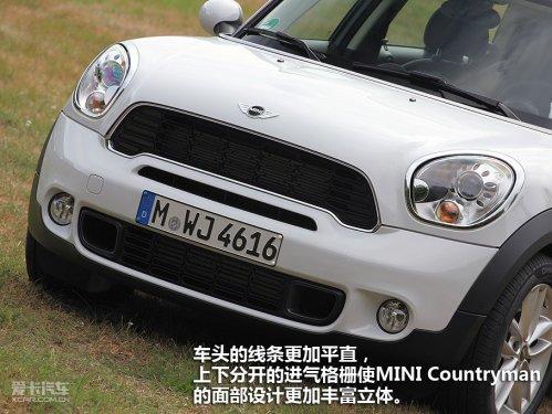 從造型上看,MINICountryman并沒有完全脫離俏皮可愛的設計路線,雖然車身尺碼一再放大,但車頭上依舊有些可愛的大燈已經很明確的展現了MINI的一大設計特征,車外后視鏡也是100%的MINI風格。車頭的線條更加平直,不過你絕不會用硬朗來形容它,上下分開的進氣格柵使MINICountryman的面部表情更加豐富立體,即便是充滿動感的CooperS,也不會在引擎蓋上開一個通風口,而是比較含蓄的放在了上下進氣格柵之間。