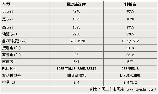 在車身尺寸上,江鈴陸風SUV長4740mm、寬1895mm、高1825mm,軸距為2750mm,與科帕奇相比略大一些。在比較重要的越野指標上,陸風SUV接近角為29度、離去角26度。在動力上,陸風SUV搭載2.4L四缸柴油機,有5座和7座兩種內飾設計。