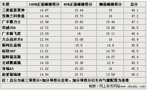 通過以上表格,我們可以看出這樣一個現(xiàn)象,12款車當中涉及自主品牌、日韓系列和德美系列各國車型。很多人一直堅信德美系的車要比其他兩類車要結實,但事實證明他們的成績也并非那么無懈可擊。看來C-NCAP的鐵證也可以做一回流言終結者了,不過這12款車全部達到了45分以上,也就是C=NCAP五星級安全標準。至于傳說中的五星半級別,在比較常見的國產(chǎn)車中只有雅閣和CR-V達到。