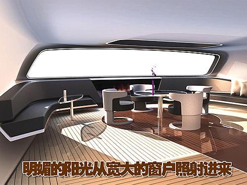 除了酒吧間外,其盥洗室也是同樣典雅的風格。優質的鋁金屬裝潢增添了貴族的氣息,環形的設計營造了溫馨的氛圍。輪船的尾端則是一個愜意的小型休閑空間,原型的小桌前放置這四個小巧舒適的沙發,在其后面則是兩個深色的沙發,從寬大的一體式窗戶投進了明媚燦爛的陽光。