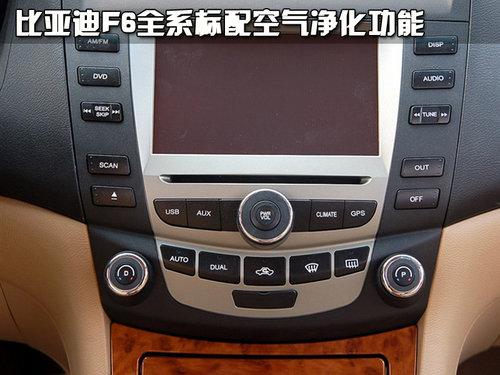 比亞迪F6長4846mm,寬1822mm,高1465mm的車身,2740mm的軸距,提供寬敞舒適的的駕乘空間;同時也提供了高端配置。例如在駕乘舒適性方面,F6新財富版2.0L尊貴型擁有雙層雙模天窗、雙溫區獨立控制自動空調、方向盤音響控制系統、DVD多媒體系統以及NAVI語音導航系統等配置。