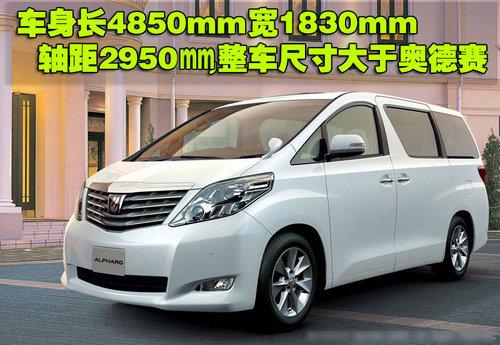 目前日本本土銷售的豐田Alphard是其第二代車型,分為兩驅(qū)和四驅(qū)兩個(gè)版本,兩驅(qū)車型的車身長(zhǎng)4850mm 。寬1830 mm ,高1890mm,四驅(qū)車型的車身長(zhǎng)為4850 mm ,車寬1830 mm ,高1905mm,而軸距均為2950mm。