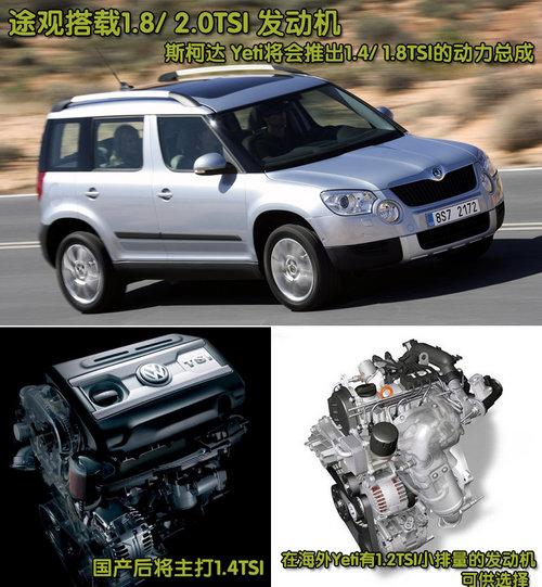 上海大眾Tiguan途觀搭載的是1.8/2.0TSI兩款發動機,而很明顯Tiguan途觀主打1.8TSI排量的車型。而即將國產的斯柯達Yeti也將推出兩款排量的發動機分別是1.4/1.8TSI,國產后因為與Tiguan途觀定位不同,走的是“低價”路線,所以國產后后的斯柯達Yeti將主推1.4TSI。在海外市場,斯柯達Yeti搭載了1.2/1.8TSI兩款汽油渦輪增壓直噴發動機和一款具有三種調教的2.0TDI柴油發動機。而1.2TSI發動機已經確定要國產,并有望出現在斯柯達Yeti的身上。