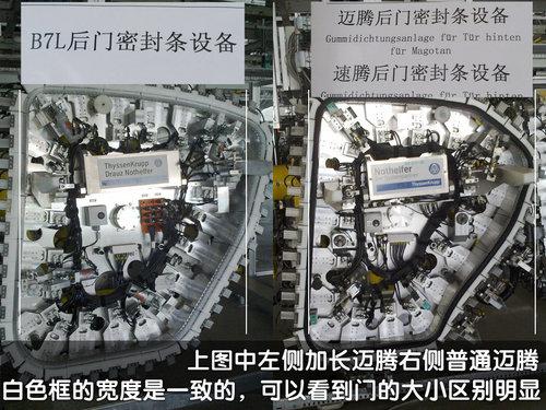 是的,在生產線上記者確實看到了寫有“B7L”字樣的車門試裝區域,但是廠家工作人員在這個部分是不允許拍照的所以沒有詳細照片。但是從車門的“夾具”(這是我們自己起的名字)來看,不同的邁騰(B7)與加長后的邁騰(BL),在門的大小上有非常明顯的區別,并且我們從工作人員那里也獲得了B7L是加長邁騰的肯定答案。