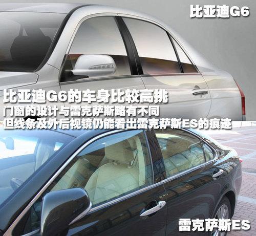 雖然以上圖片的角度有所不同,但我們可以從線條看的出來,比亞迪G6的車身比較高挑,門窗的線條雖然非常相似,但軌跡有明顯不同。比亞迪G6也采用了可折疊外后視鏡,并且集成了轉(zhuǎn)向燈功能,從上圖中可以看出來是LED轉(zhuǎn)向燈,與雷克薩斯ES的風格非常相近。