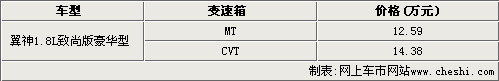 網上車市網站近日在東南三菱經銷商處獲悉,新上市的三菱翼神1.8L致尚版共推出手動擋和CVT兩款車型,售價分別是12.59萬元和14.38萬元。據悉,目前很多4S店已經有展車抵達,但消費者如果購買這款新車仍需交付5000元訂金預訂,預計一個月左右可以提到現車。