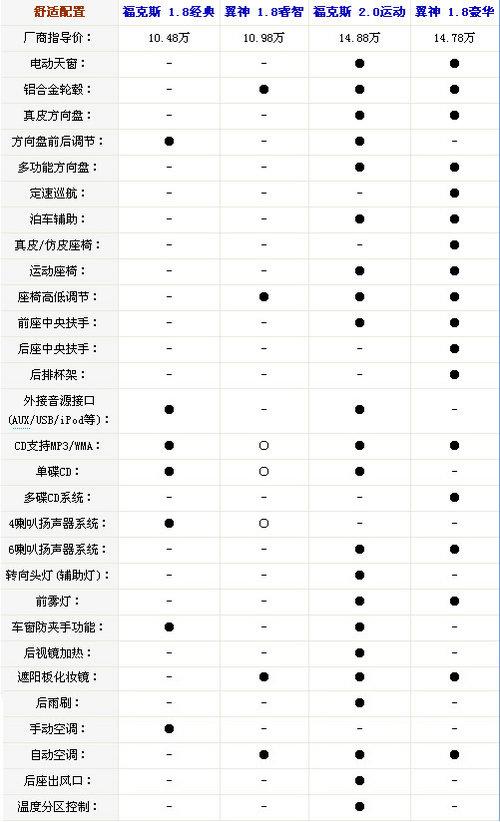 從兩車的價格來看,福克斯的價格區間更靠下一些,基本保持在15萬以內,而翼神則有部分車型售價要高于這個區間。所以我們接下來的配置比較主要針對它們價格比較接近但又相對熱銷的車型,畢竟拿兩款并不是銷售主力的頂配車型對比的意義也不大。