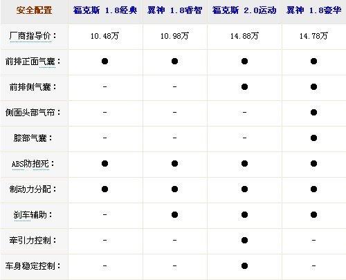 在安全配置方面,兩車的入門版車型基本保持在同一水平,正副駕駛雙安全氣囊和ABS+EBD也是目前主流的入門車型安全配置。而在較高配車型上,福克斯在主動安全上有一定優勢,其運動版車型擁有牽引力控制和電子穩定程序。翼神則在被動安全性上出色一些,側面頭部氣簾僅出現在福克斯三廂豪華型上,而全系標配的膝部氣囊在福克斯的全系都沒有配備。