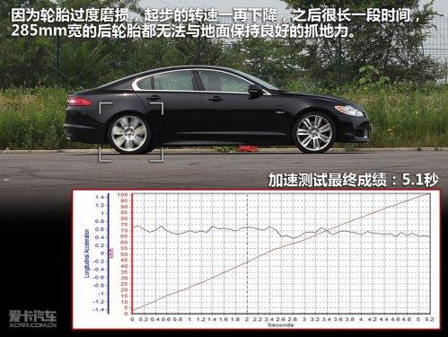 當進行加速測試時,按慣例我們會阻止所有電子系統介入,將轉速維持在發動機最佳發力區,在起步的瞬間使輪胎處于滑與不滑的臨界點,之后全力沖刺。不過很抱歉,經過多次嘗試,我們無法令XFR獲得最佳的起跑狀態,原因就是因為輪胎過度磨損,起步的轉速一再下降,而順利起步之后很長一段時間,285mm寬的后輪胎都無法與地面保持良好的抓地力。通過加速曲線圖也可以看出,起步后接近1秒的時間,加速度都不高,有時還處于下降狀態,最終5.1秒的加速成績并不是XFR的最強能力。